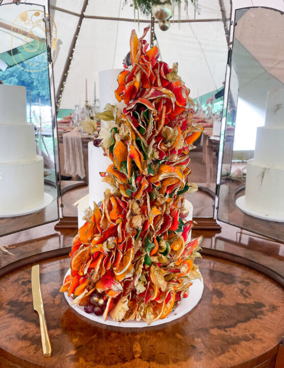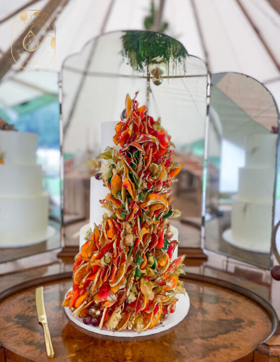 Wedding cake in orange, red and gold fruit petals. My signature wedding cake style. Wedding cake inspiration/gallery