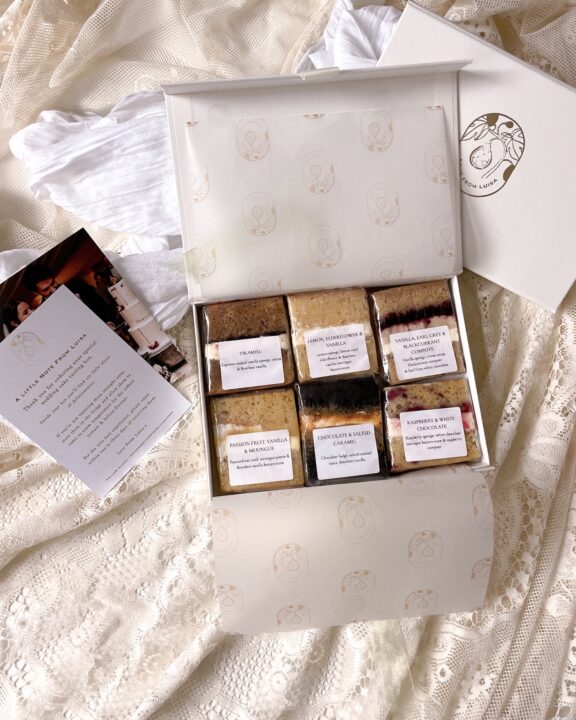 I have sourced the packaging from high-end retailers with a commitment to sustainability. The boxes are made from 92% recycled materials and can be reused or repurposed. Why not keep it for your wedding cards or gift notes etc? The cellophane is compostable (just pop it in the bin if you don’t have a compost collection), and the greaseproof paper is biodegradable (pop it in the bin, and it will biodegrade). Our printing is done with sustainable methods so that your cake tasters are as planet-friendly as possible